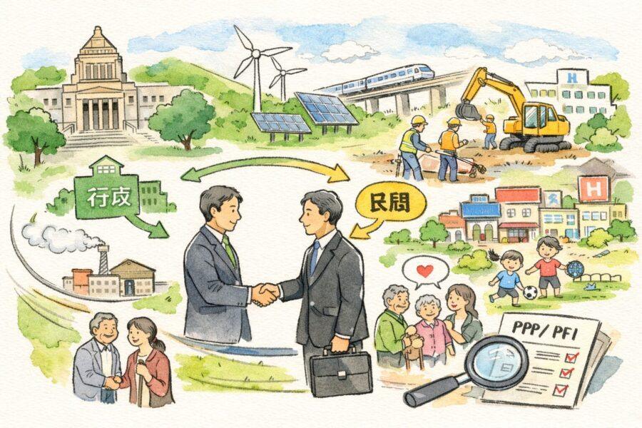 公民連携とは、国や自治体などの公的機関と、企業を中心とした民間部門が協力し、公共サービスや社会インフラの整備、運営を行う仕組みです。代表的な形として、公共施設の建設や管理運営を民間が担うPPPやPFIがあります。これらは、行政がすべてを直接実施する従来型のモデルとは異なり、役割分担を前提としています。