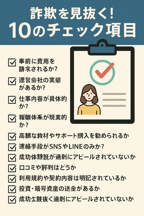 副業に申し込む前に、以下の10項目をチェックしてみてください。1つでも当てはまれば、警戒すべきサインですので注意しましょう。
