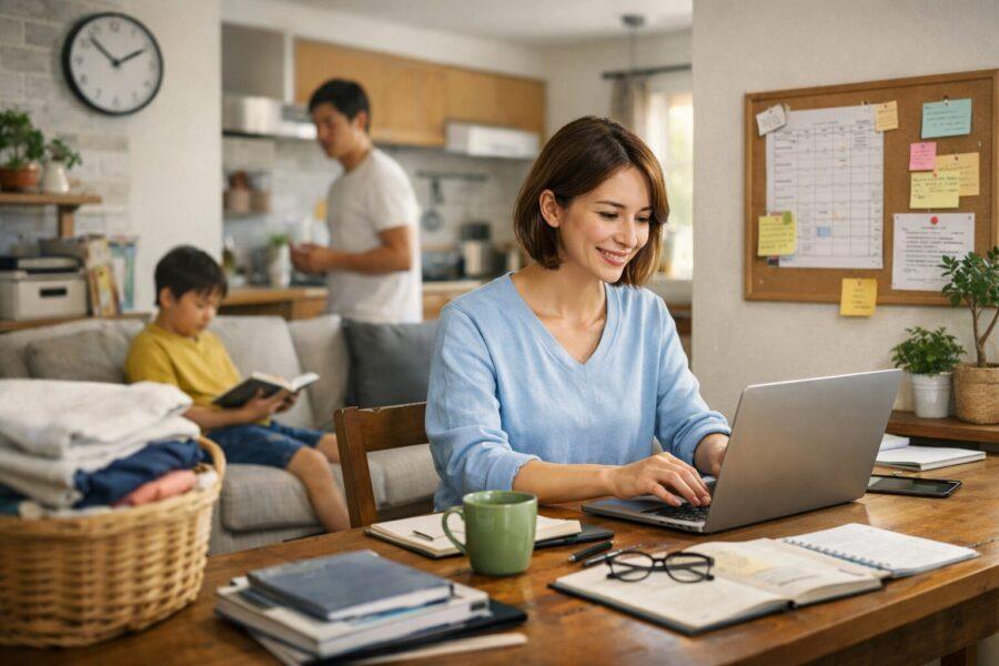 家で働けるようになったのに、なぜか毎日が楽にならない。朝は家事と支度でバタつき、昼は仕事に集中したいのに生活が割り込み、夕方は家族対応で息つく暇がない。そんな状態が続くと、時間が足りないだけでなく、切り替えができない疲れが積み上がります。