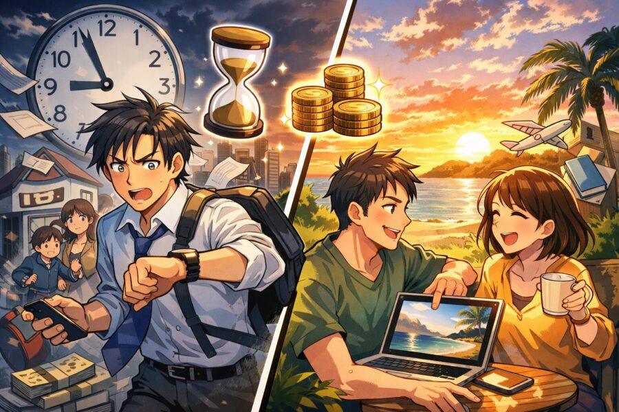 なぜ同じ収入を得ているにもかかわらず、人によって人生の余裕に大きな差が生まれるのでしょうか。その違いを生み出している要因として注目したいのが、時間とお金という二つの資源の扱い方です。多くの人は収入の多寡が人生の豊かさを決めると考えがちですが、幸福度に関する研究では、収入そのものよりも自由に使える時間の有無が、人生満足度に強く影響することが示されています。実際、同じ収入水準であっても、自由時間を確保できている人ほど、生活全体への満足度が高い傾向にあります。