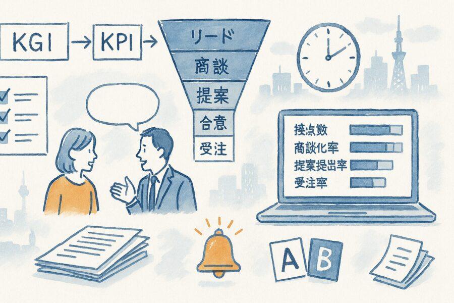 最終目標をKGIとして明文化し、接点数や商談化率、提案提出率、受注率などのKPIに割り戻します。数式は紙一枚で説明できる簡潔さが運用の鍵です。