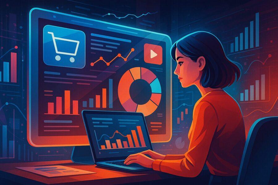 まず習得すべきはGoogleAnalytics(GA)、GoogleDataStudio(GDS)、Googleスプレッドシートです。GAでは流入経路ごとの訪問数、直帰率、CVRを把握します。GDSではGAとスプレッドシートを連携し、「売上」「CVR」「流入元別成果」をダッシュボード化します。スプレッドシートにはECプラットフォームのCSV売上データを取り込み、商品別売上やキャンペーン別CPAを集計します。これにより「SNS経由の直帰率が高いので広告文を修正する」「メール訴求でCVRを1.5倍に高める」といった具体策を迅速に立案できます。GDSのスケジュール機能で月次PDFレポートを自動配信すれば、レポート作成はほぼ自動化されます。