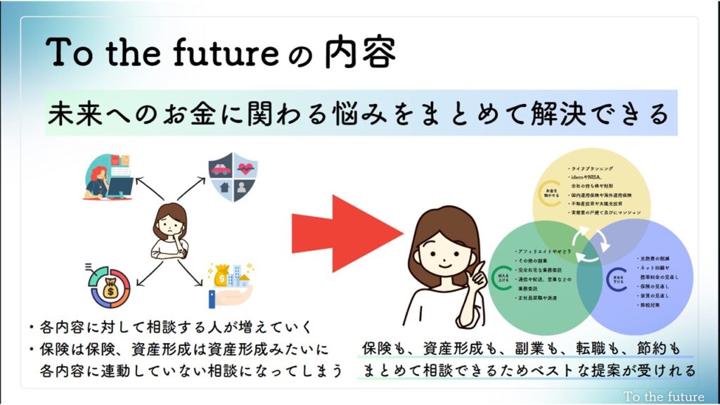 今までは資産運用にお金を入れすぎていましたが、ライフプランの相談をしたところ、自分に合った商品を紹介していただけました。以前のモノよりも運用益が高いため、毎月4万円の支出が削減され、さらに副業で毎月5万円の収入が増えました。老後の心配も減りましたし、毎日が楽しくなりました。